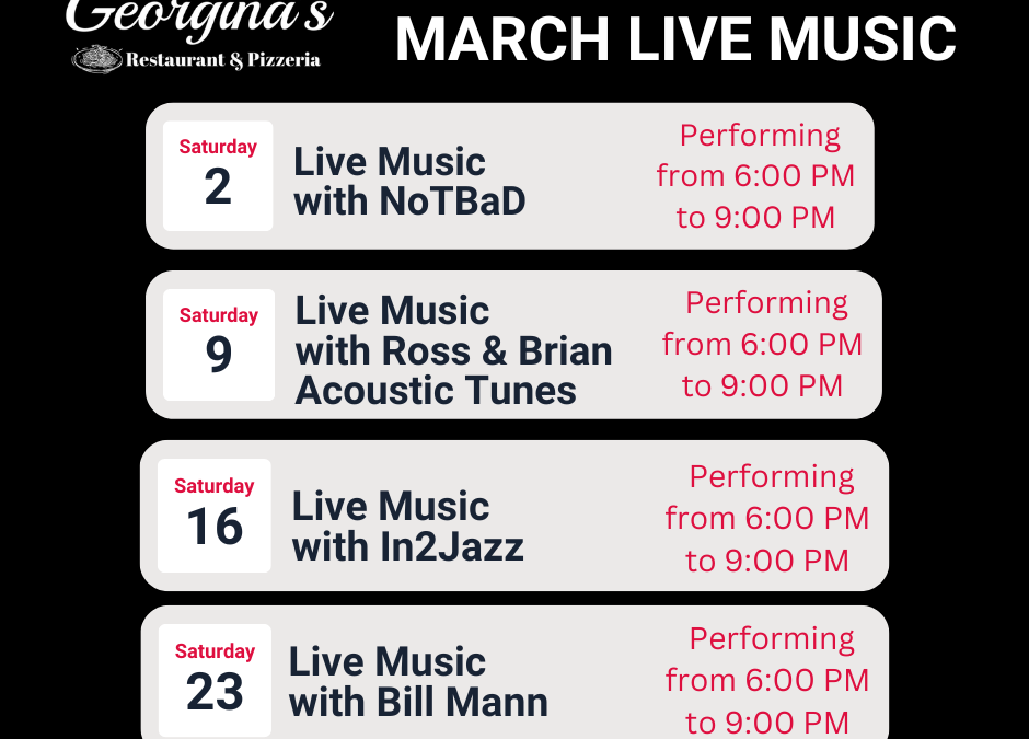 Live music Saturday nights from 6-9pm. Here’s what’s coming this month at Georgina’s.